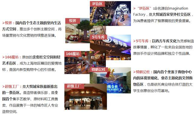 以大悅城為例,在原有商場的基礎上,打造出獨具特色的“悅界”、“5號車庫”“IF街區(qū)”、“魔方166”等特色主題街區(qū),提供多樣化服務來制造新的利潤增長點。